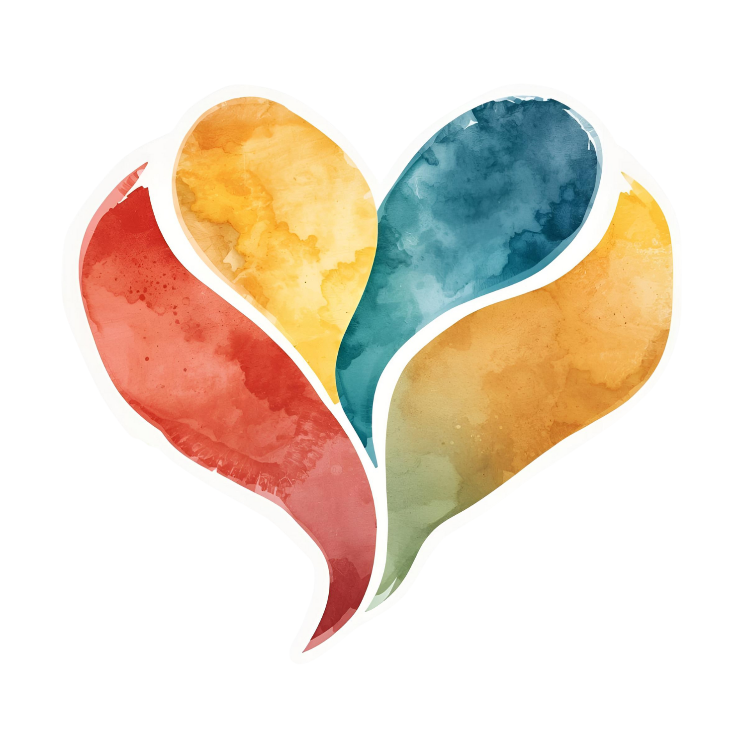 Watercolor illustration of a heart shape made from four colorful leaf-like shapes in red, yellow, blue and orange.