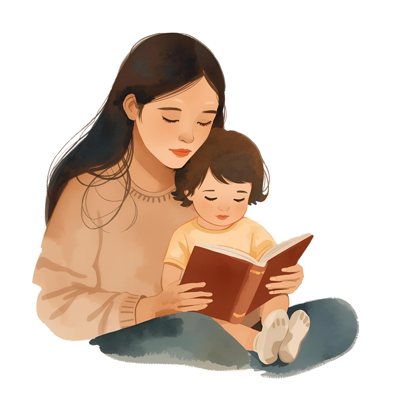 Illustration of a woman and a young girl reading a book together, sitting on the floor. The woman has long dark hair and the girl has short dark hair, both looking down, focused on the book.